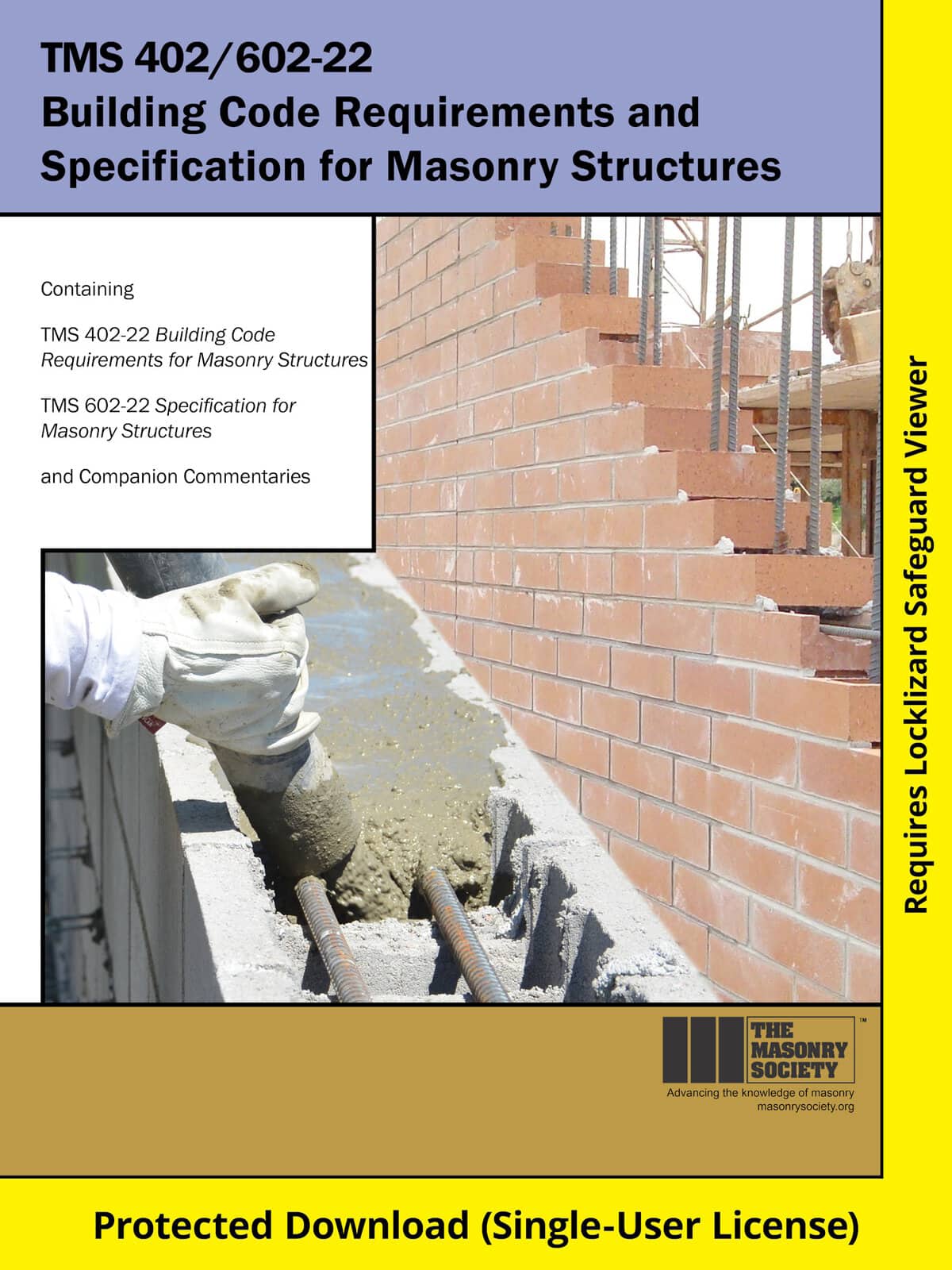TMS 402/602-22 Building Code Requirements and Specification for Masonry Structures contains two standards and their commentaries: Building Code Requirements for Masonry Structures designated as TMS 402 (and formerly designated as TMS 402/ACI 530/ASCE 5) and Specification for Masonry Structures designated as TMS 602 (and formerly designated as TMS 602/ACI 530.1/ASCE 6).